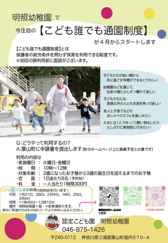 明照幼稚園では、今注目の『こども誰でも通園制度』を4月からスタートすることになりました。