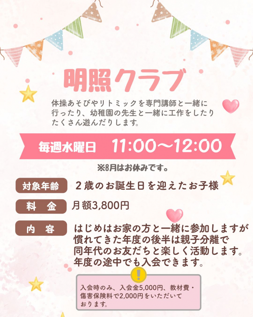 明照クラブでは、お友だちがお家の方といっしょに園で楽しい経験をし、慣れてきた年度の後半は、親子分離で同年代のお友だちと楽しく活動します。体操やリトミックを専門の先生から習ったり、幼稚園の先生と一緒に楽しい活動をしています!同年齢のお友だちと一緒に遊ぶことでたくさんの刺激を受けて成長し、少しずつ自立する姿が見られる事でしょう。また入園前に幼稚園の雰囲気を感じる事ができます。
