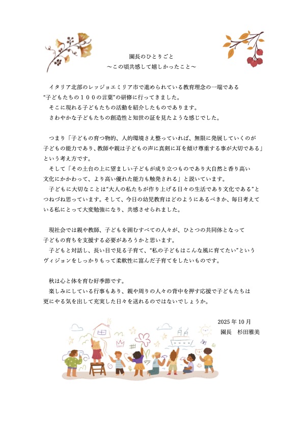 園長のひとりごと 2025年10月 2025 10/02 2025.10.02 2025.10.02 よかったらシェアしてね! URL Copied! URL Copied! 園長のひとりごと 2025年9月