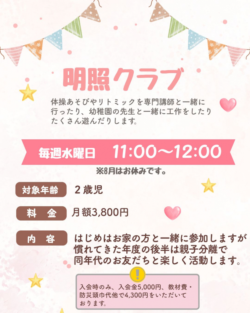 明照クラブでは、お友だちがお家の方といっしょに園で楽しい経験をし、慣れてきた年度の後半は、親子分離で同年代のお友だちと楽しく活動します。体操やリトミックを専門の先生から習ったり、幼稚園の先生と一緒に楽しい活動をしています!同年齢のお友だちと一緒に遊ぶことでたくさんの刺激を受けて成長し、少しずつ自立する姿が見られる事でしょう。また入園前に幼稚園の雰囲気を感じる事ができます。