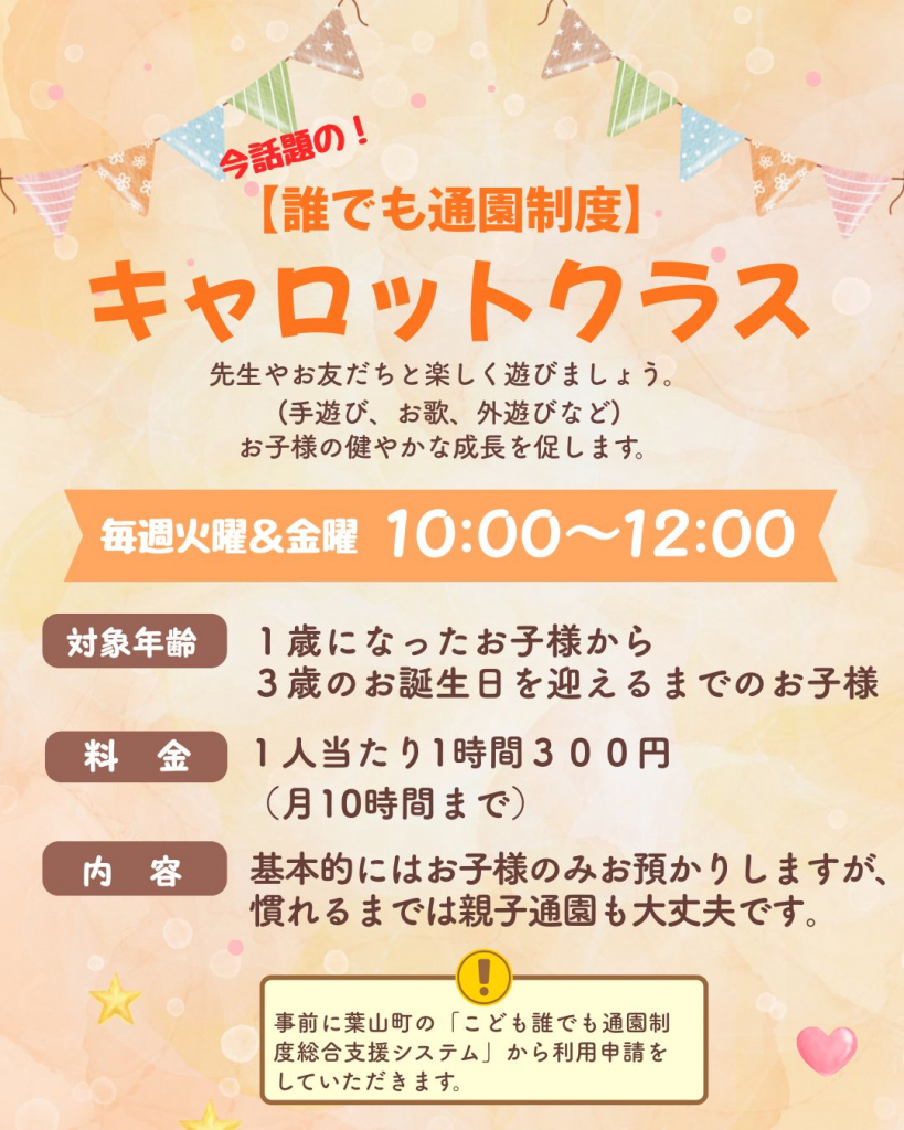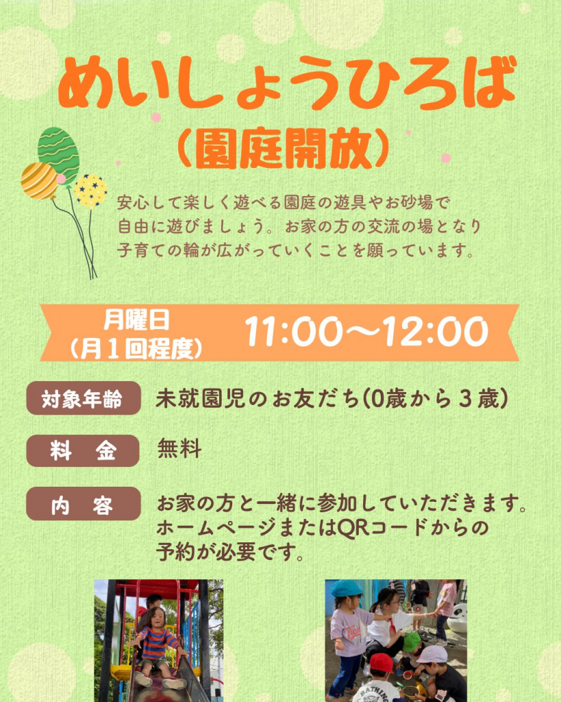 「パチパチクラブ1歳&2歳クラス」が【こども誰でも通園制度】を利用した「キャロットクラス」に変わります!!そして月に1回程度「めいしょうひろば」(園庭開放)を行います。