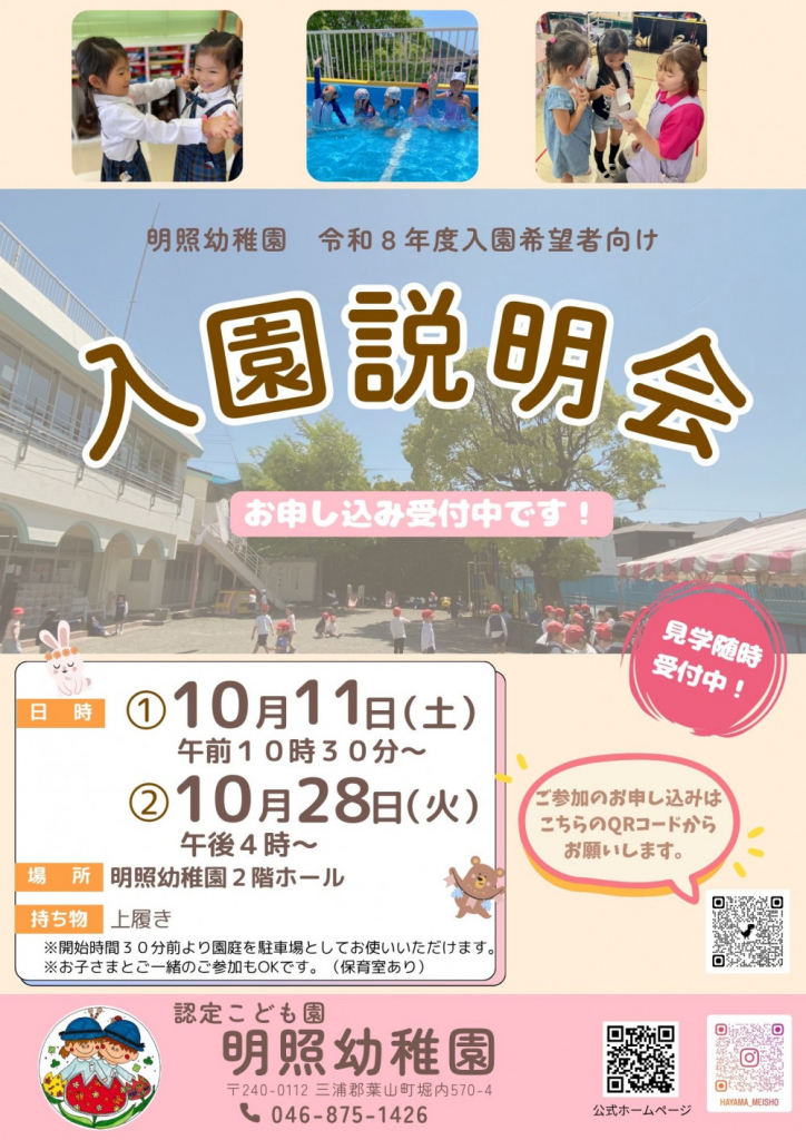 随時受付しています。ご希望の方はお電話でお申し込みください。見学の時間は11時から1時間くらいです。普段の幼稚園生活をご覧いただくことができる貴重な機会です。皆様のお越しをお待ちしています。